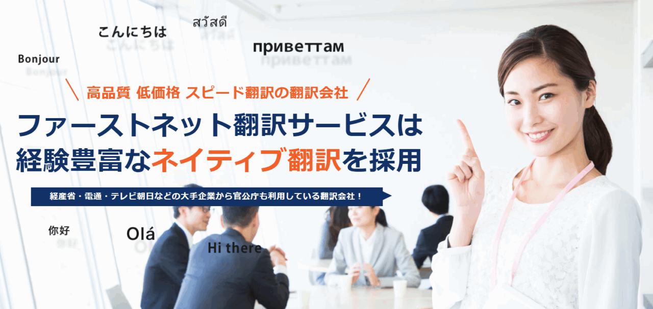 株式会社ファーストネットジャパンが提供する「ファーストネット翻訳サービス」は、英語・中国語をはじめ12か国語に対応し、経験豊富なネイティブ翻訳者を採用することで、高品質でありながらリーズナブルな価格と迅速な納品を実現しています。