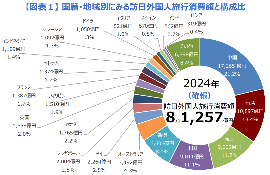 観光庁の調査によると、2024年における訪日中国人の旅行消費総額は17,265億円に達し、訪日外国人全体の21.2%を占めました。