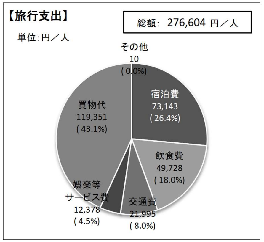 中国人観光客の1人あたりの旅行支出額は約27.6万円で、全体平均の22.7万円を上回っています。2024年の訪日外国人の費用別に見ると、買物代が約11.9万円と最も高く、次いで宿泊費が約7.3万円、飲食費約4.9万円の順で高い傾向です。
